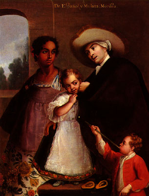 «Pintura de Castas», óleo de Miguel Cabrera (hacia el año 1763), donde se muestra a un español jugando con su hija, nacida de su unión con una mujer mulata. España promovió el mestizaje en América, un fenómeno amplísimo en toda la América hispana, regulado incluso por la legislación de Indias.