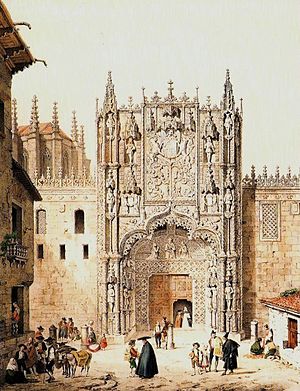 Pórtico del Colegio de San Gregorio de Valladolid, según una litografía romántica del siglo XIX. Aquí tuvo lugar la célebre controversia que enfrentó a Bartolomé de las Casas y a Juan Ginés de Sepúlveda, entre 1550 y 1551.