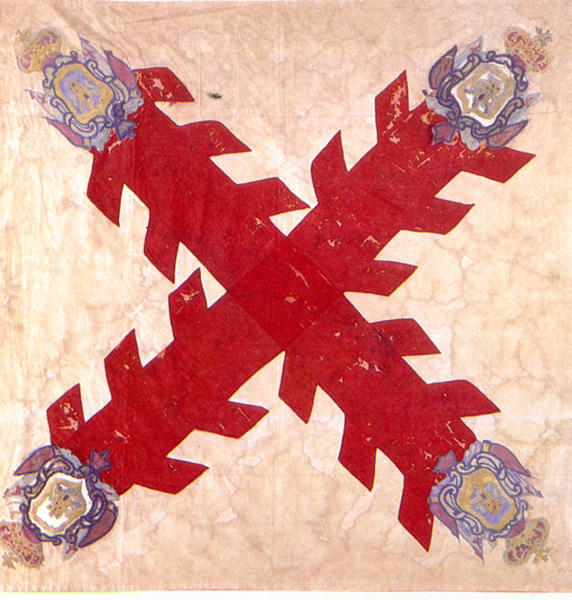 Pendón con la Cruz de Borgoña o San Andrés, rematada con cuatro escudos, dos leones y dos castillos. Imagen tomada del Catálogo de la Colección de Banderas, Museo Nacional de Historia, INAH, México. Es el símbolo vexilológico más utilizado durante toda la época indiana (siglos XVI a XVIII) y todavía hoy presente en banderas de muchas ciudades y territorios americanos.