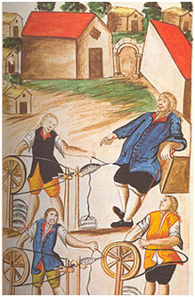 Detalle del dibujo «Indios hilando lana a torno», del libro Trujillo del Perú, del obispo Martínez Compañón (siglo XVIII).