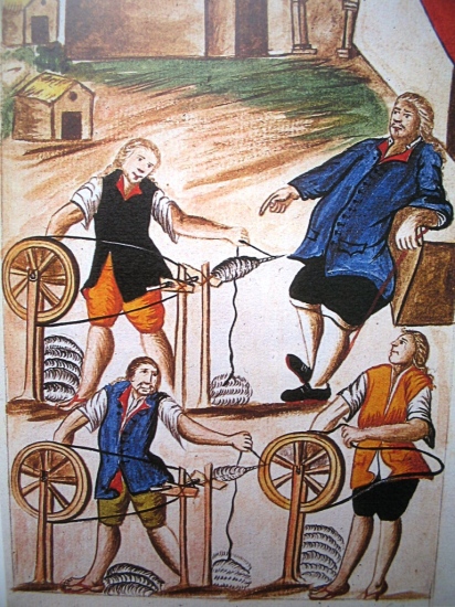 Obrajes en una litografía del siglo XVIII incluida en la obra «Trujillo del Perú», del obispo Martínez Compañón. Los partidarios de la protección de la industria indiana ya advirtieron en su día que el librecambio con Inglaterra supondría la ruina y desunión de las provincias americanas, como así fue.
