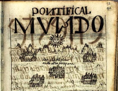 Detalle de una lámina titulada «Pontifical mundo» incluida en la obra «Nueva Corónica y buen gobierno» (principios del siglo XVII), del cronista indígena Felipe Guamán Poma de Ayala, en donde se puede leer la frase «las Yndias del Perú en lo alto de España» [pulsar en la imagen para ampliar]