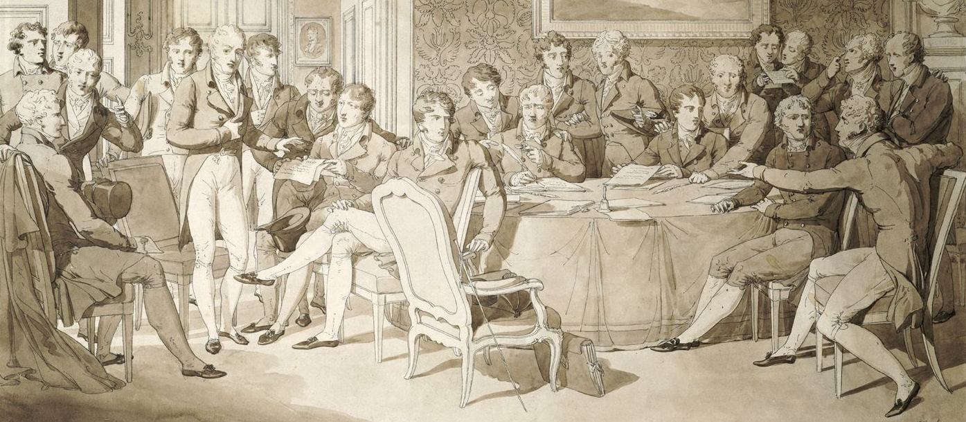 Detalle de un grabado del Congreso de Viena representado por J. B. Isabey. Inglaterra manipuló este Congreso para lograr el control de las rutas marítimas mundiales, mientras intervenía militarmente en Hispanoamérica para destruir su unidad y así asegurar la dominación política, comercial y financiera británica.