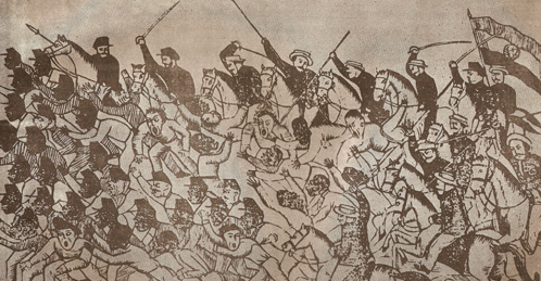 Combate de caballería, xilografía de Ignacio Aquino publicada en el periódico «Cabicuí». Los intereses del Imperio Británico, apoyados por su aliado el Imperio del Brasil, provocaron la Guerra de la Triple Alianza, que destruyó casi por completo al Paraguay e impidió que Hispanoamérica pudiera constituirse como una sola Nación.